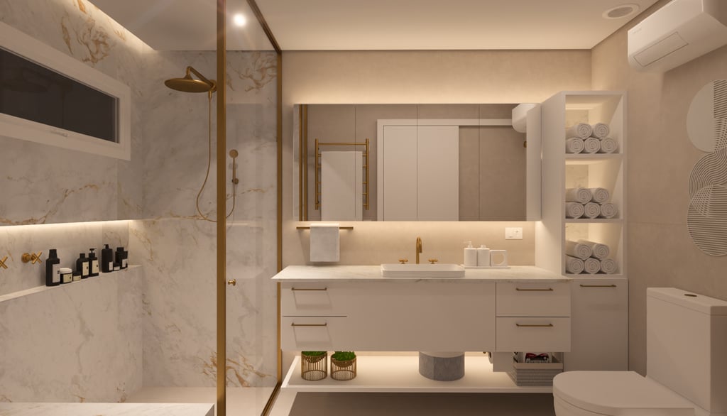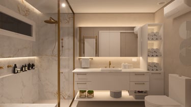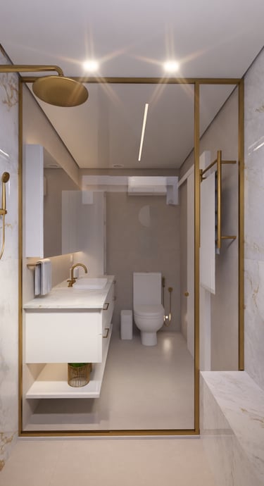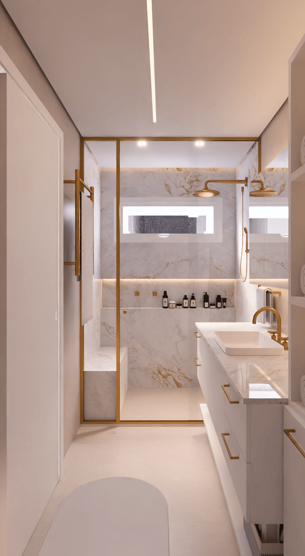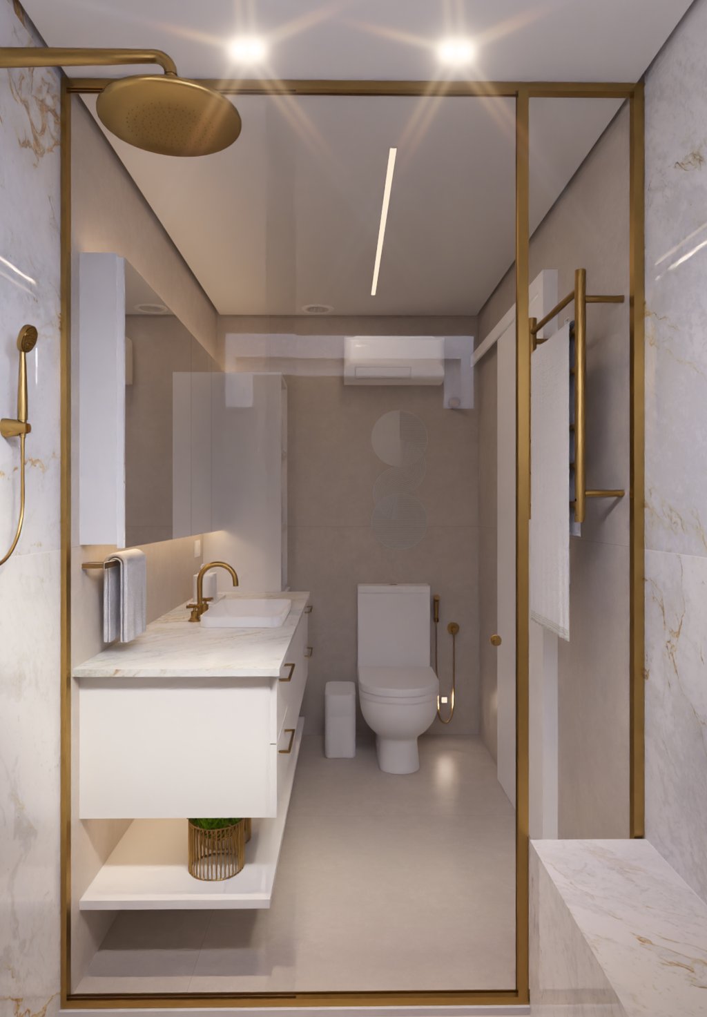 A missão deste projeto foi criar um modelo sofisticado, para impressionar os visitantes, trazendo detalhes em ouro, que vão desde o piso na área do box que imita o mármore paraná, à pedra de mármore paraná da bancada e metais.