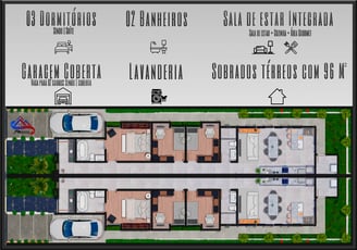 Cada sobrado conta com 96m² de área.